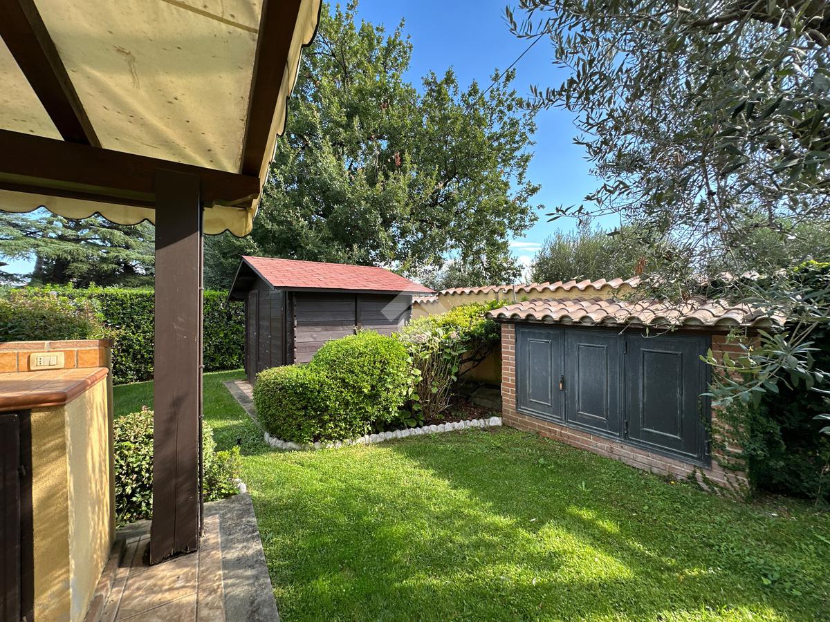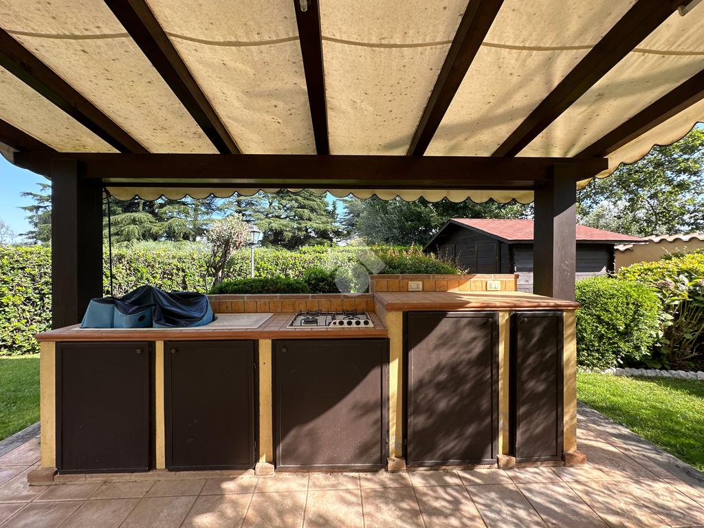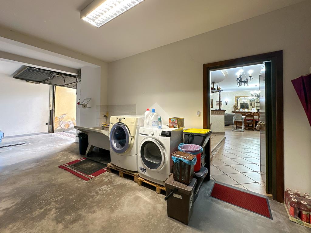 Da una porta blindata si accede all’ampio garage di circa 100 mq, dotato di accesso diretto alla rampa con cancello automatico che conduce al giardino. Quest’ultimo è impreziosito da un portico in legno con angolo cottura esterno, ideale per vivere al meglio gli spazi all’aperto e organizzare momenti conviviali, e da un fabbricato in legno completo di bagno e ripostiglio.