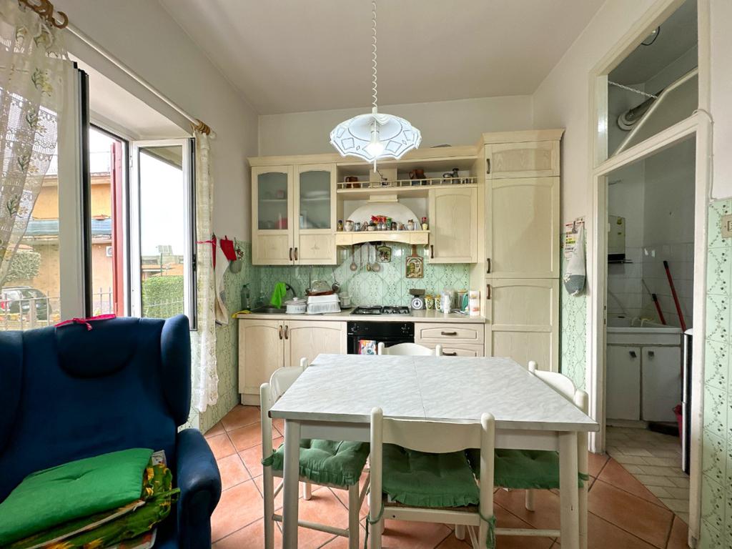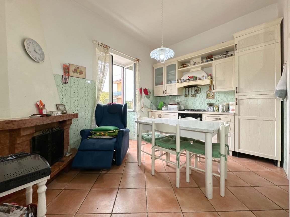 Entrando, si viene accolti da un comodo disimpegno che conduce alla zona giorno, composta da salone e cucina abitabile, impreziosita da camino e dotata di ripostiglio.