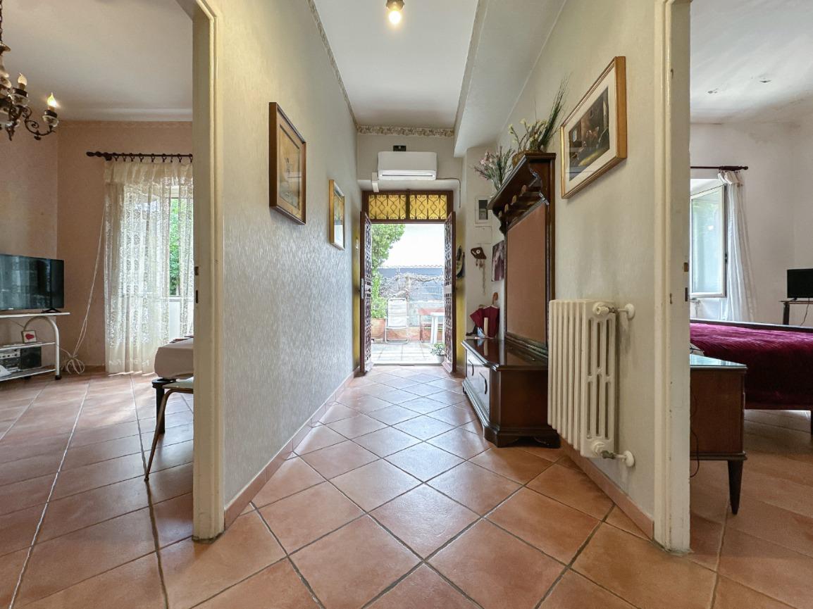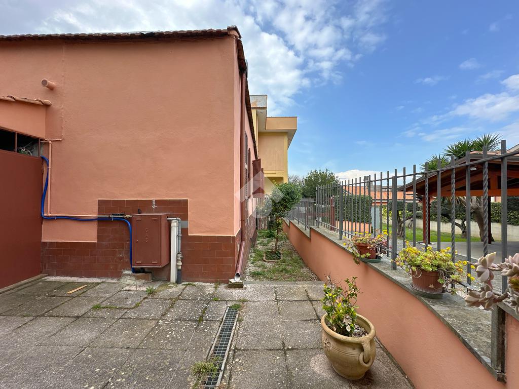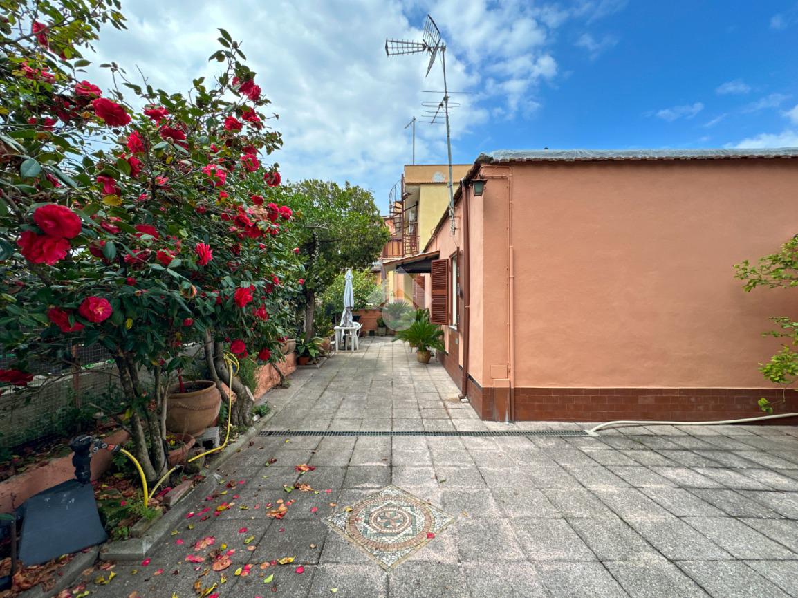 Si accede alla proprietà tramite un giardino pavimentato di circa 80 mq che circonda l’abitazione su tre lati.