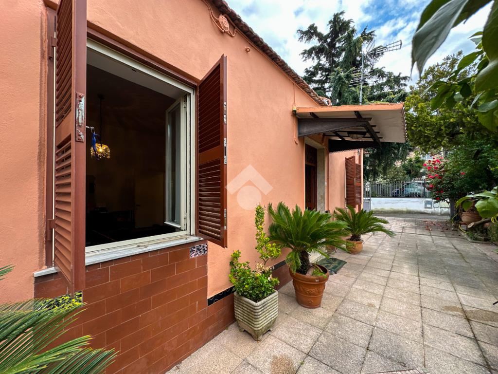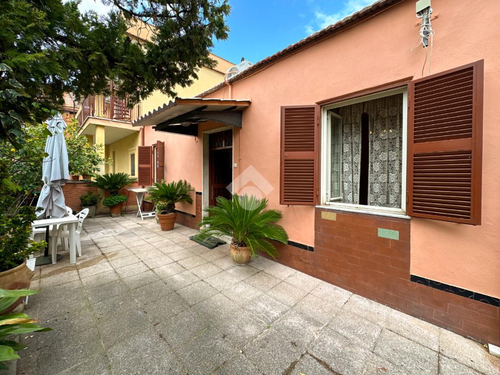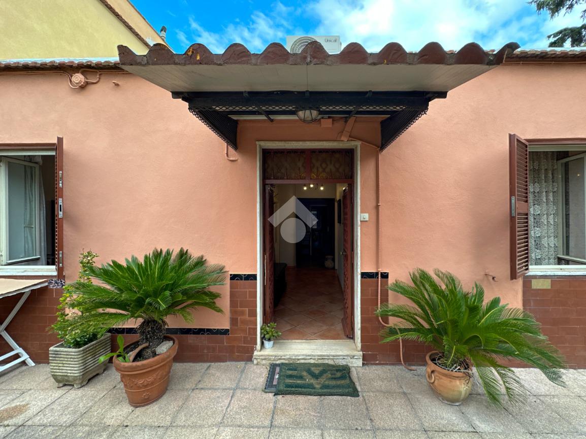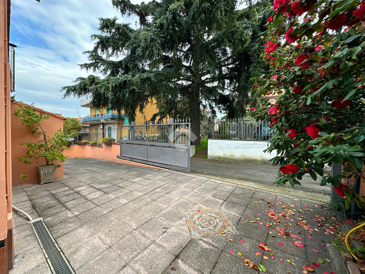 Si accede alla proprietà tramite un giardino pavimentato di circa 80 mq che circonda l’abitazione su tre lati.